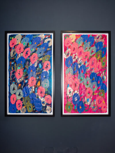 Kwaga is a painter who combines paper collages and acrylic to create bold large-scale paintings. Through her practice, Kwaga repeatedly explores densely layered colour combinations and formations of circular shapes. Working across four paintings at a time, Kwaga has developed her own systematic painting process; initially collaging pre-painted circles into ordered patterns as a base layer before applying varying layers of paint. Each layer has its own unique approach. Over time the patterns laid down have shifted from tight order into looser, diagonal formations with layers of thick painterly loops. The work gradually evolves as Kwaga confidently applies thick brush marks, revelling in the rich colours and paint texture. As each layer is added the underlayer of collaged circles disappears, leaving an echo of dense, looped circles.