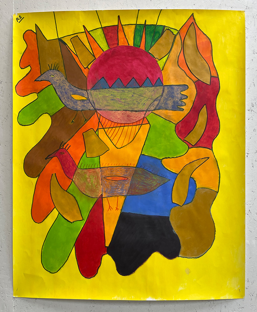 Bird With Shapes, 2024, acrylic, ink, soft pastel and pen on paper. 84 x 118cm