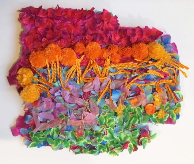Drawing inspiration from everyday objects, cultural references, and the interplay of colour, Ajanthan’s work invites viewers to reconsider the potential of simple materials. The result is an expressive, almost sculptural collage that blurs the boundaries between traditional craft and contemporary art.