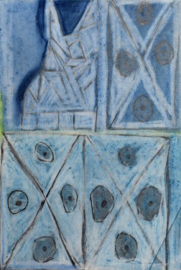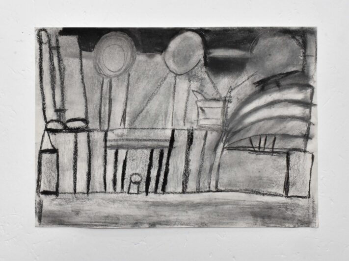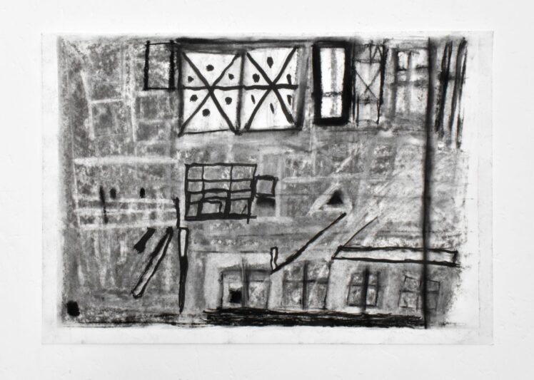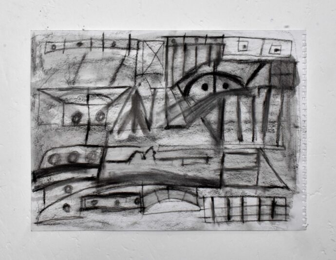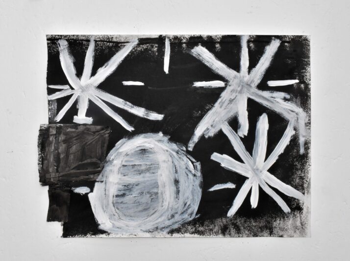 Working with a stripped-back colour palette, James constructs complex, layered surfaces through collage and drawing—primarily using charcoal and a rubber. These pieces explore what he calls ‘the complications of life,’ drawing on themes such as the ‘rhetorical nightmare,’ ‘Nick Cave’s hands,’ and ‘blank like it’s the nothingness.’