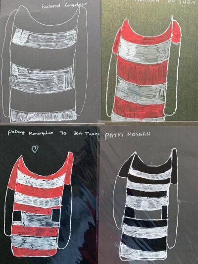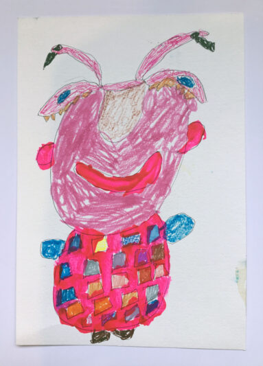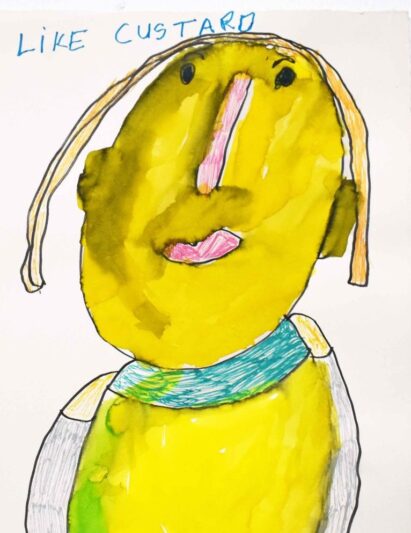 Working primarily on A4 paper with mixed media, Patricia’s approach is instinctive and direct. She often includes short phrases or single words in her images, “Like Custard” or “Nice Weather,” lifted from her own spoken reflections. These quiet, poetic fragments add another layer of personality and presence to the work.