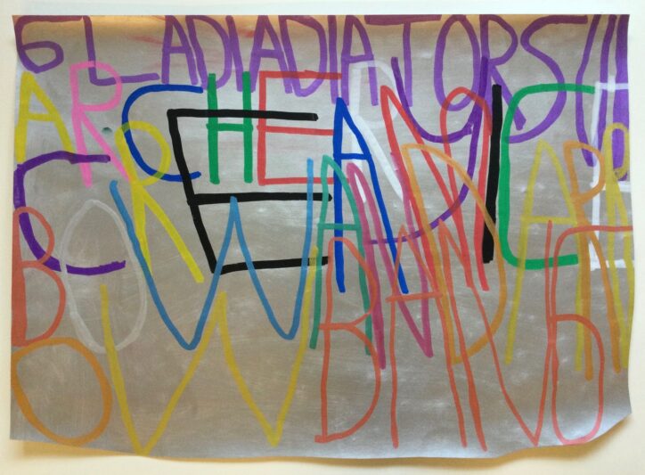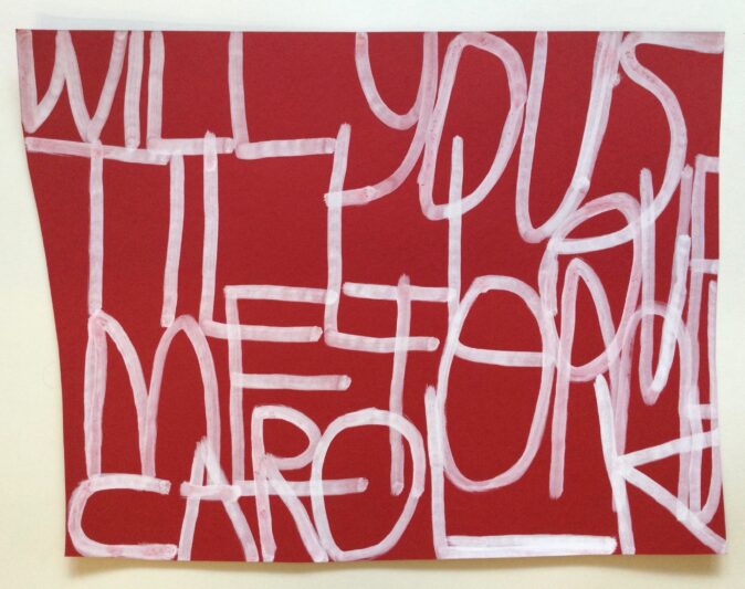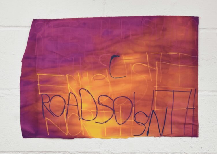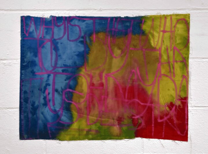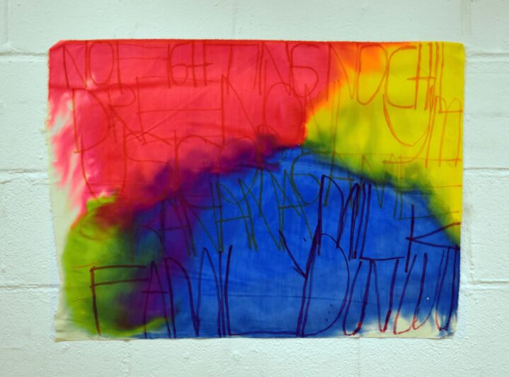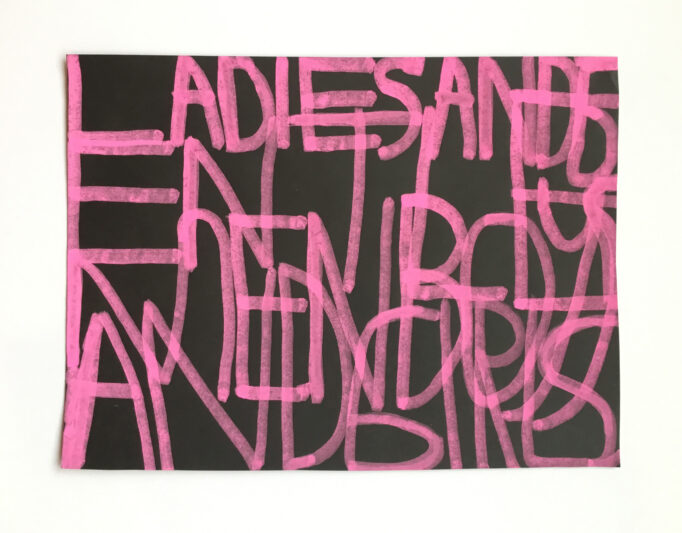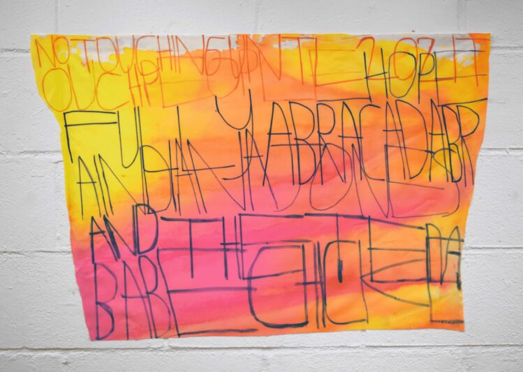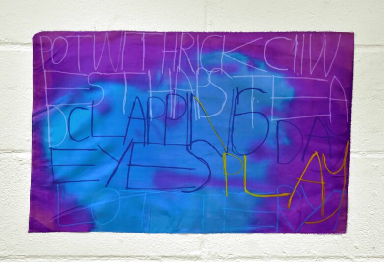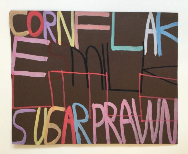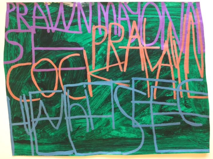 Patrick uses handwritten text on a variety of surfaces, including painted coloured paper, wallpaper, and fabrics, to record thoughts, events and sounds from his daily life. His interests—ranging from music, video games, and films to cartoons, food, and family—often serve as inspiration. His creative process is deeply influenced by the sounds and rhythms around him. While working, he listens to music and watches videos, capturing words and phrases from his environment. A shop sign, a lyric from a song, or even a line from a film might spark his next idea.