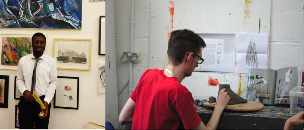 Image: Jide Bamgbose at Art Is Part of The Equation at the Royal Academy, 2018 (left) and Bert McKinnel in the studio at Cockpit Arts (right).