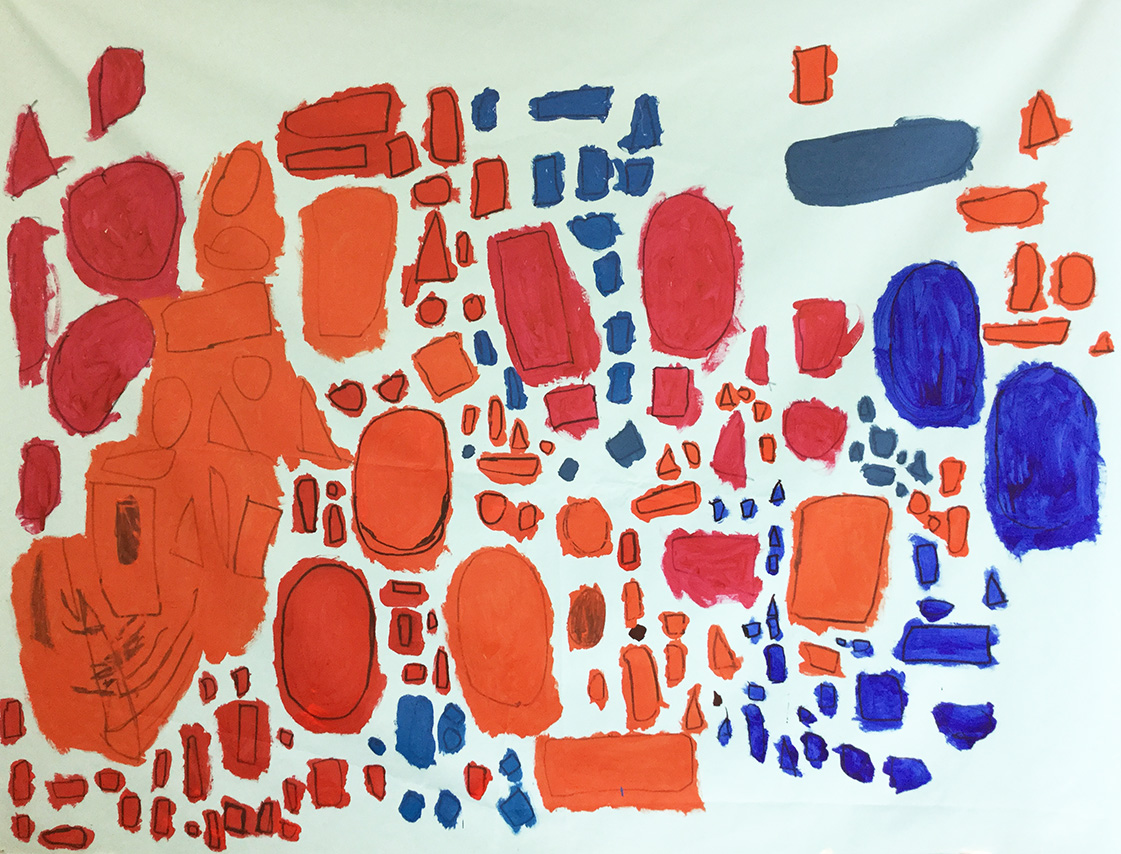 Jorell creates bright, bold collages and drawings using small pieces of vinyl and colour to build up large compositions. A recent abstract series of work has been inspired by the colours of seating plans for Wembley stadium.